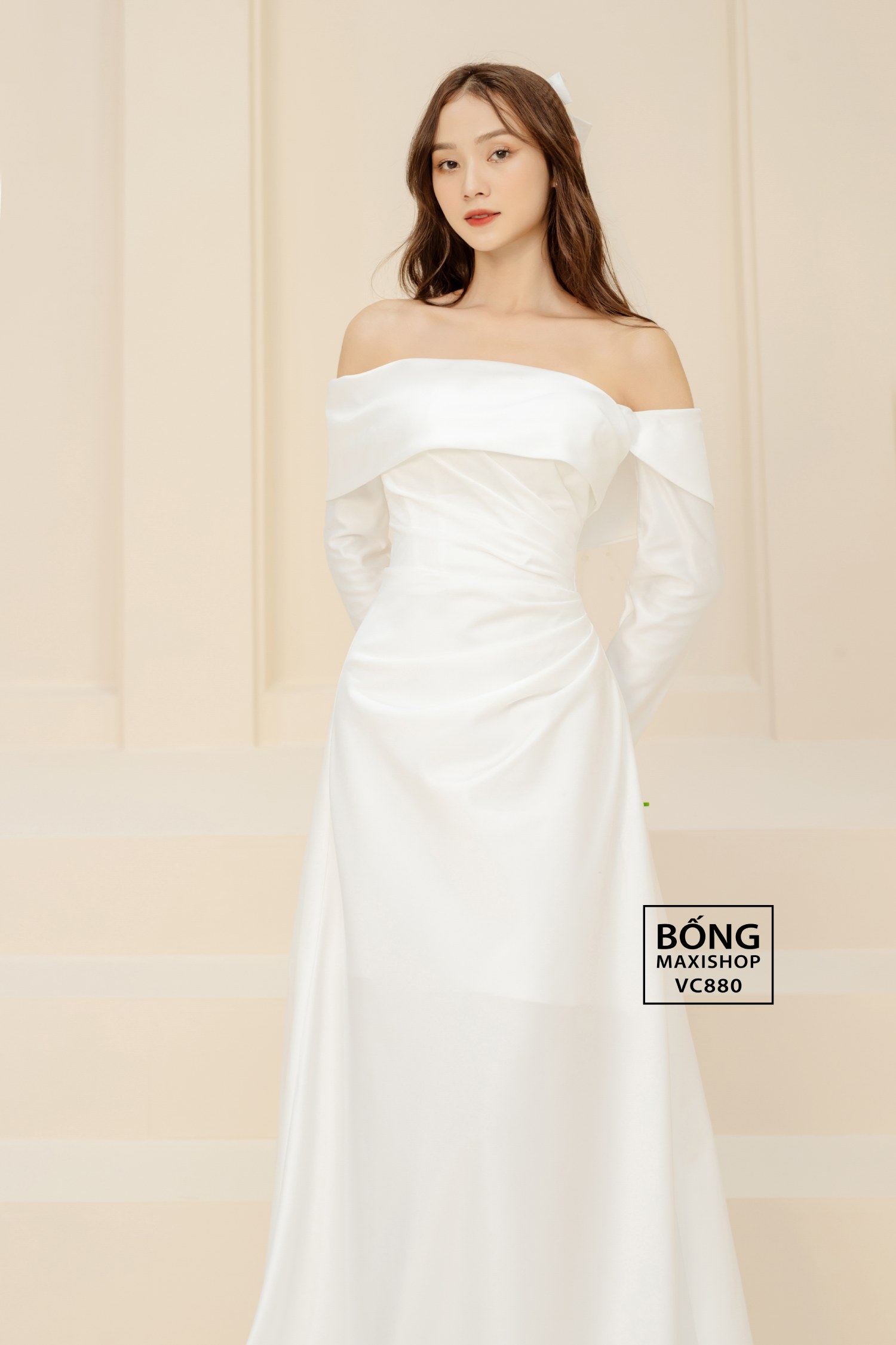 Mua ngay: Váy cưới phi nhật tay dài trễ vai bản to nhún eo trắng VC880