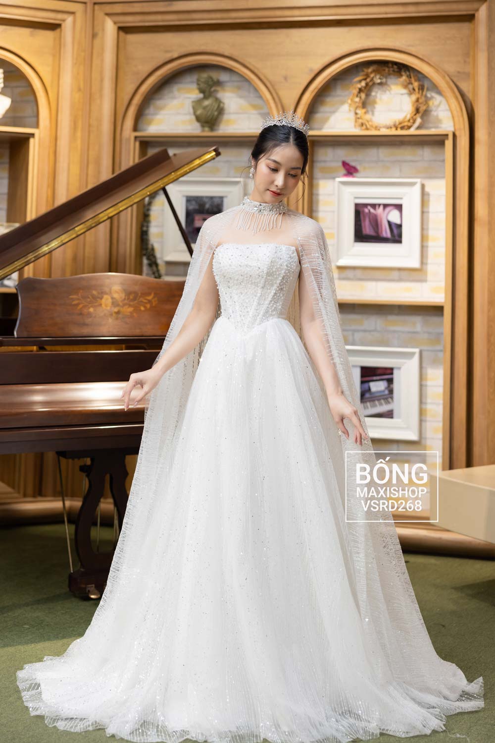 Mua ngay: Váy cưới kim tuyến cup trắng tùng gân hoa bèo choàng VSRD268