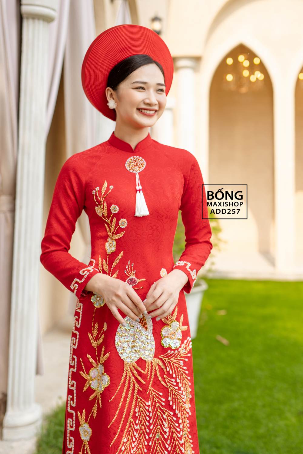 Mua ngay: Áo dài cô dâu gấm đỏ hoàng gia kết phụng ADD257