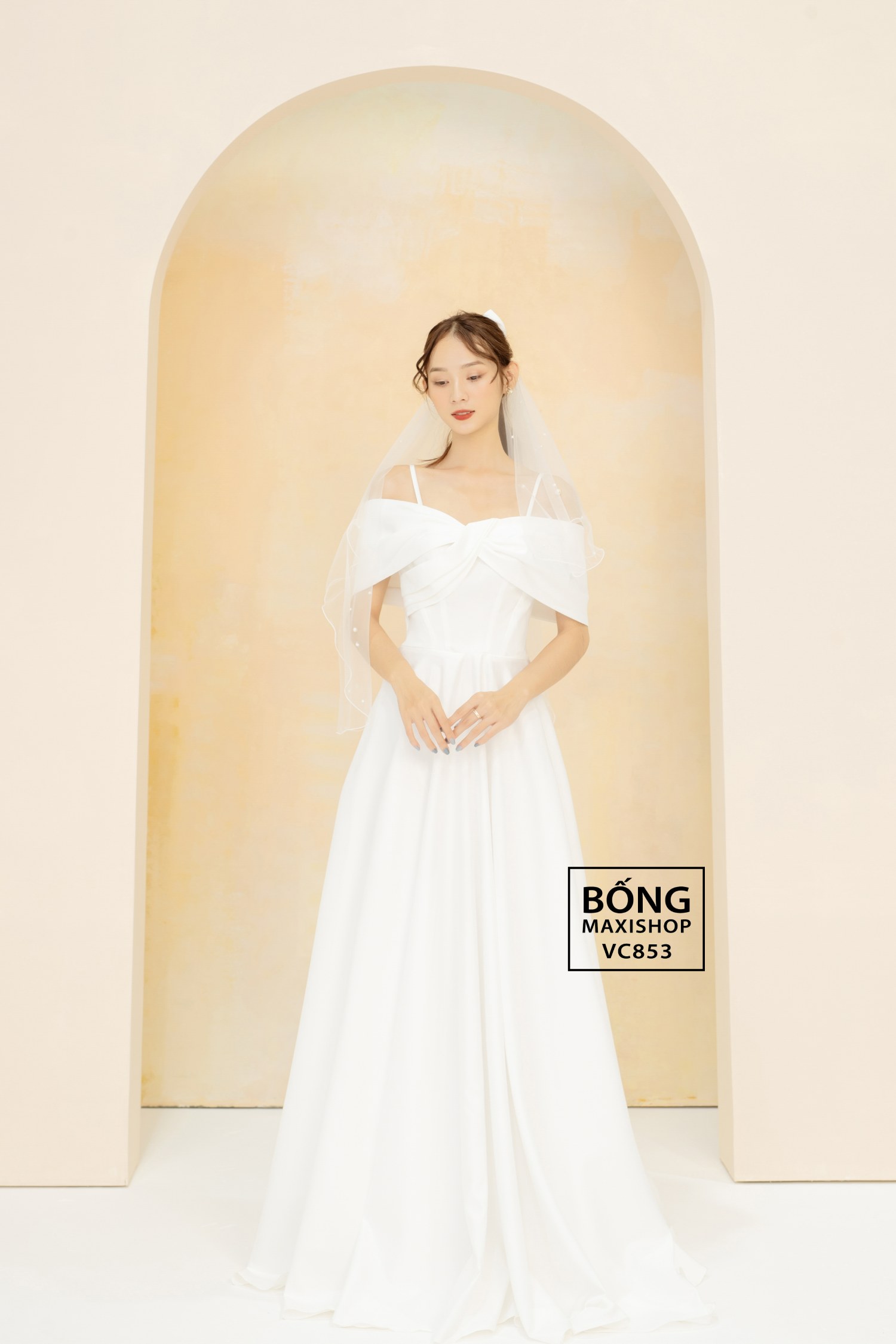 Váy cưới phi nhật chéo hình nơ hai dây trắng VC853 trong những mẫu váy cưới đẹp nhất 2022 của Bống