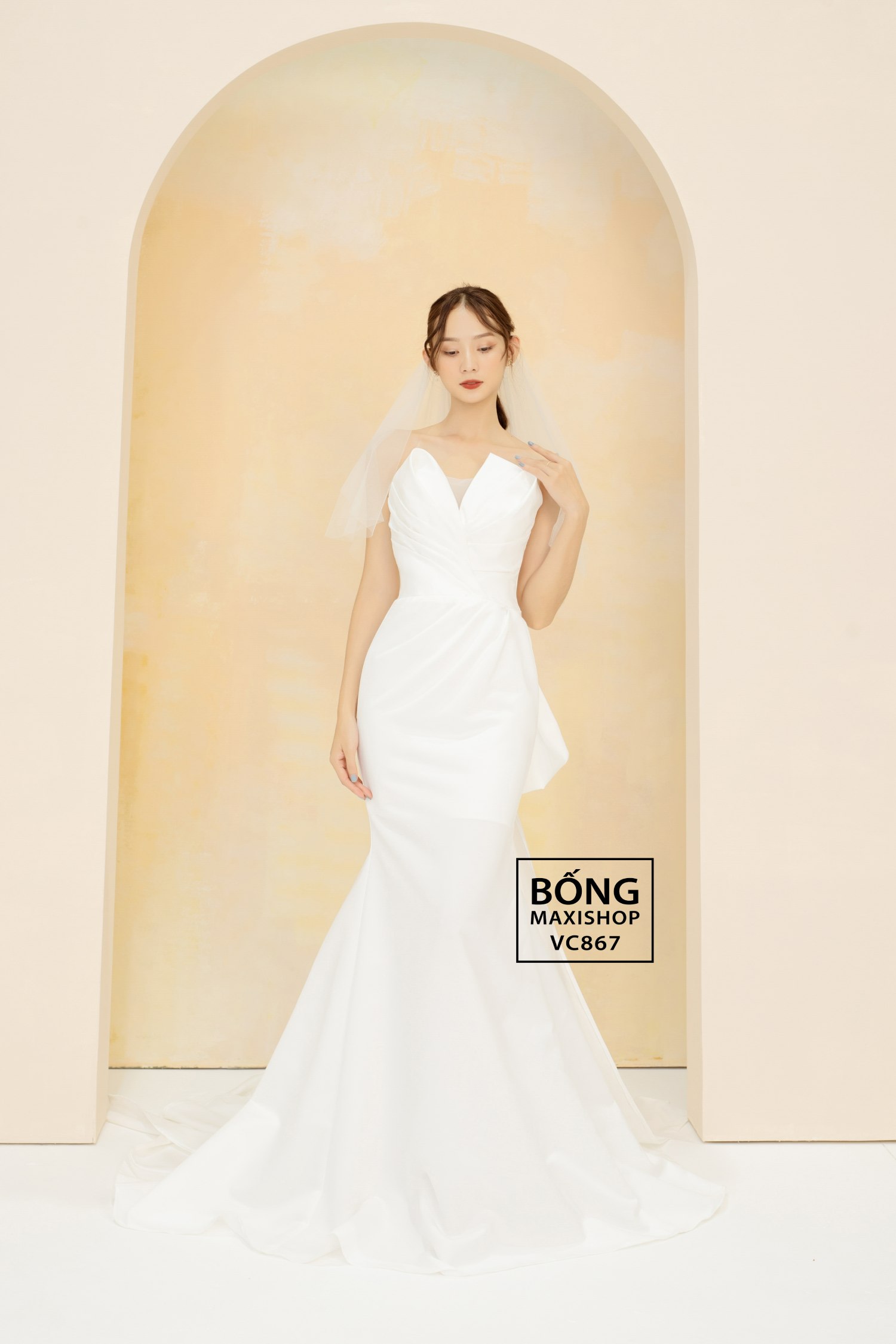 Váy cưới phi nhật cúp ngực xếp ly đuôi cá trắng VC867 trong những mẫu váy cưới đẹp nhất 2022 của Bống