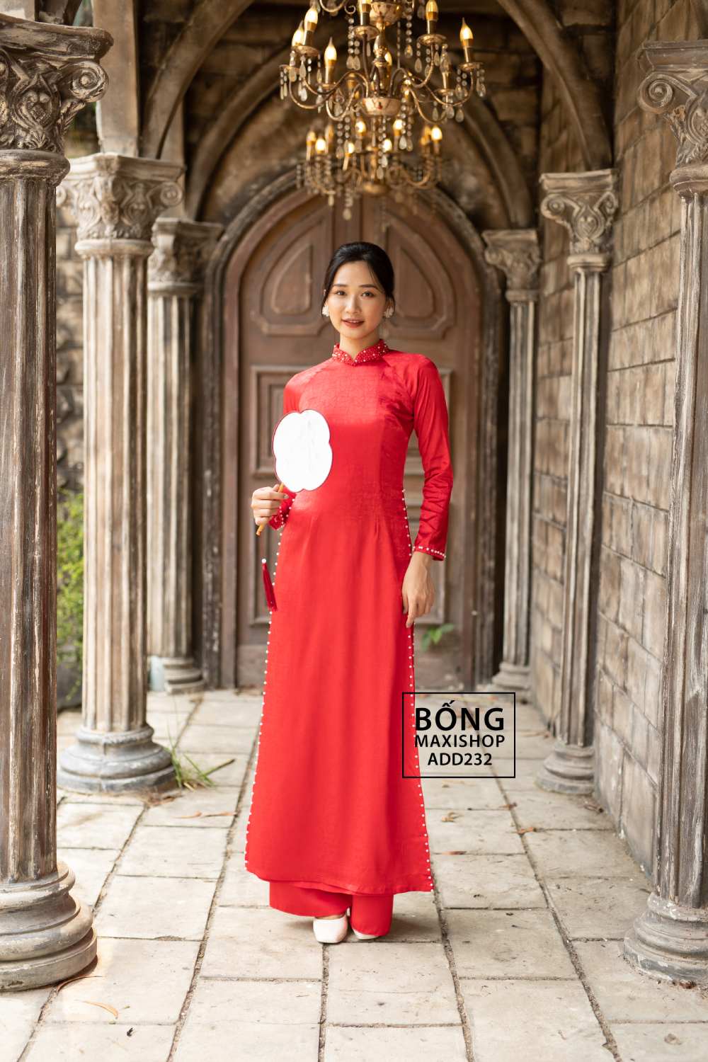 Cô dâu mặc áo dài gấm đỏ kết ngọc dọc hai bên ADD205