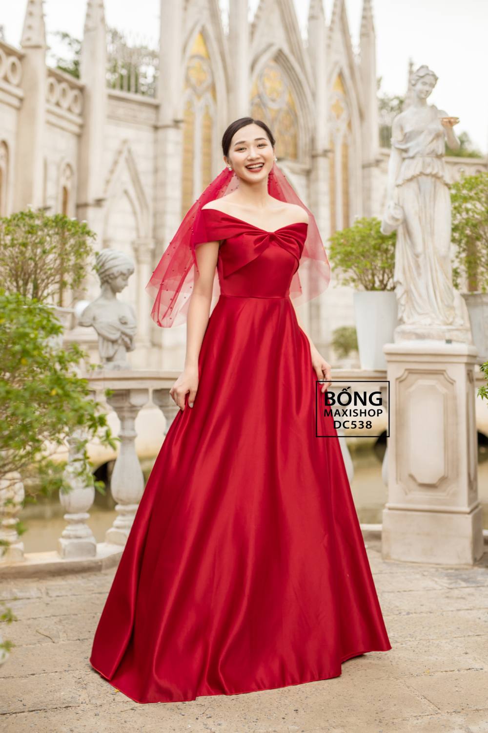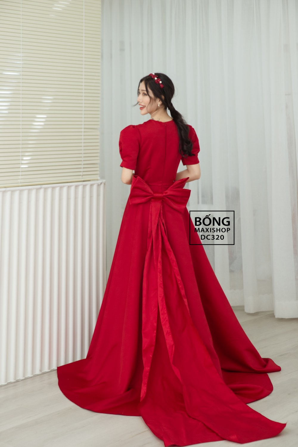 Váy cưới được yêu thích tại shop bán váy cưới đơn giản Bống Maxi - Váy Cưới Phi Nhật Đỏ Nơ Kép 145 DC320