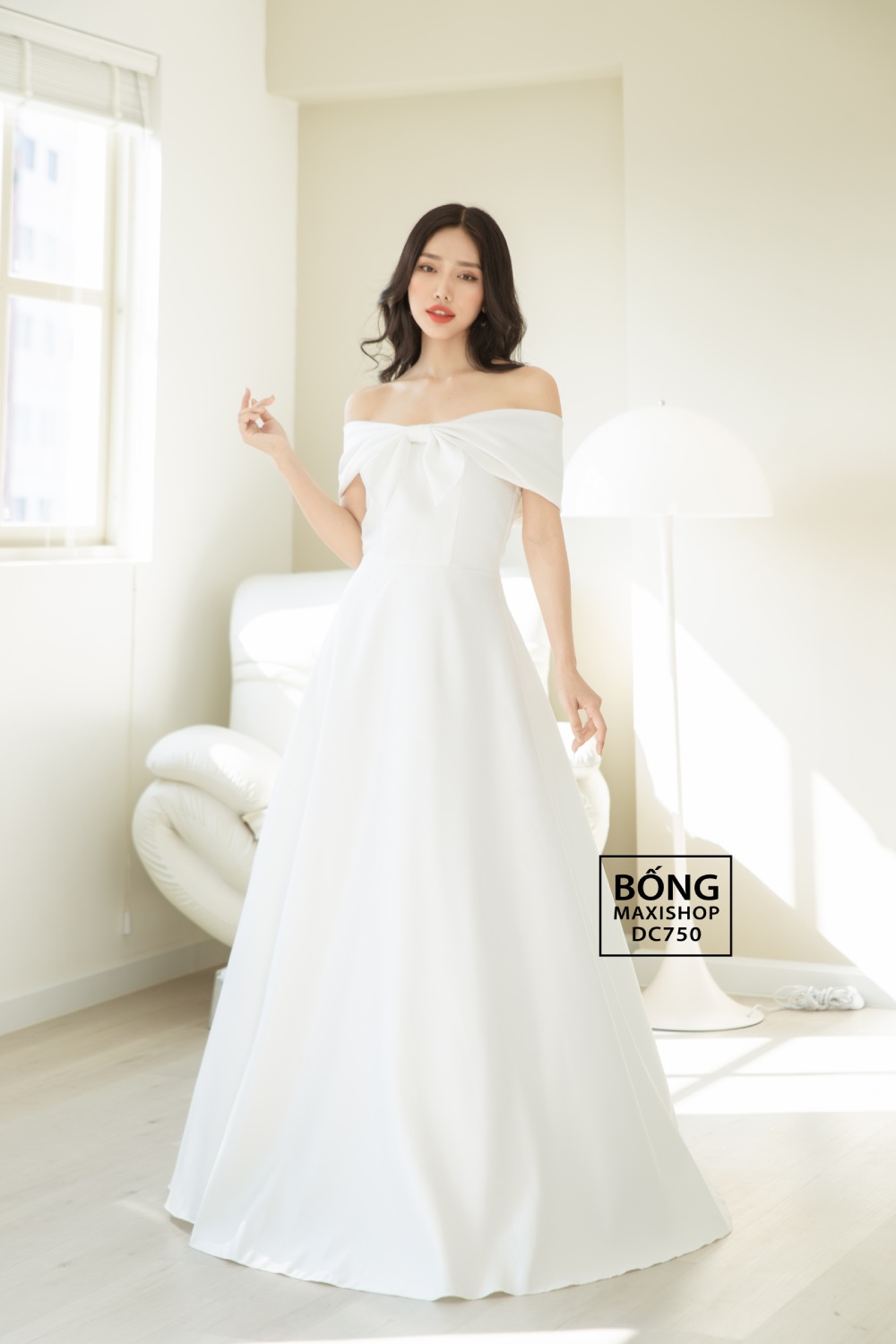 Váy cưới được yêu thích tại shop bán váy cưới đơn giản Bống Maxi - Váy cưới phi nhật trắng trễ vai nơ chính diện DC750