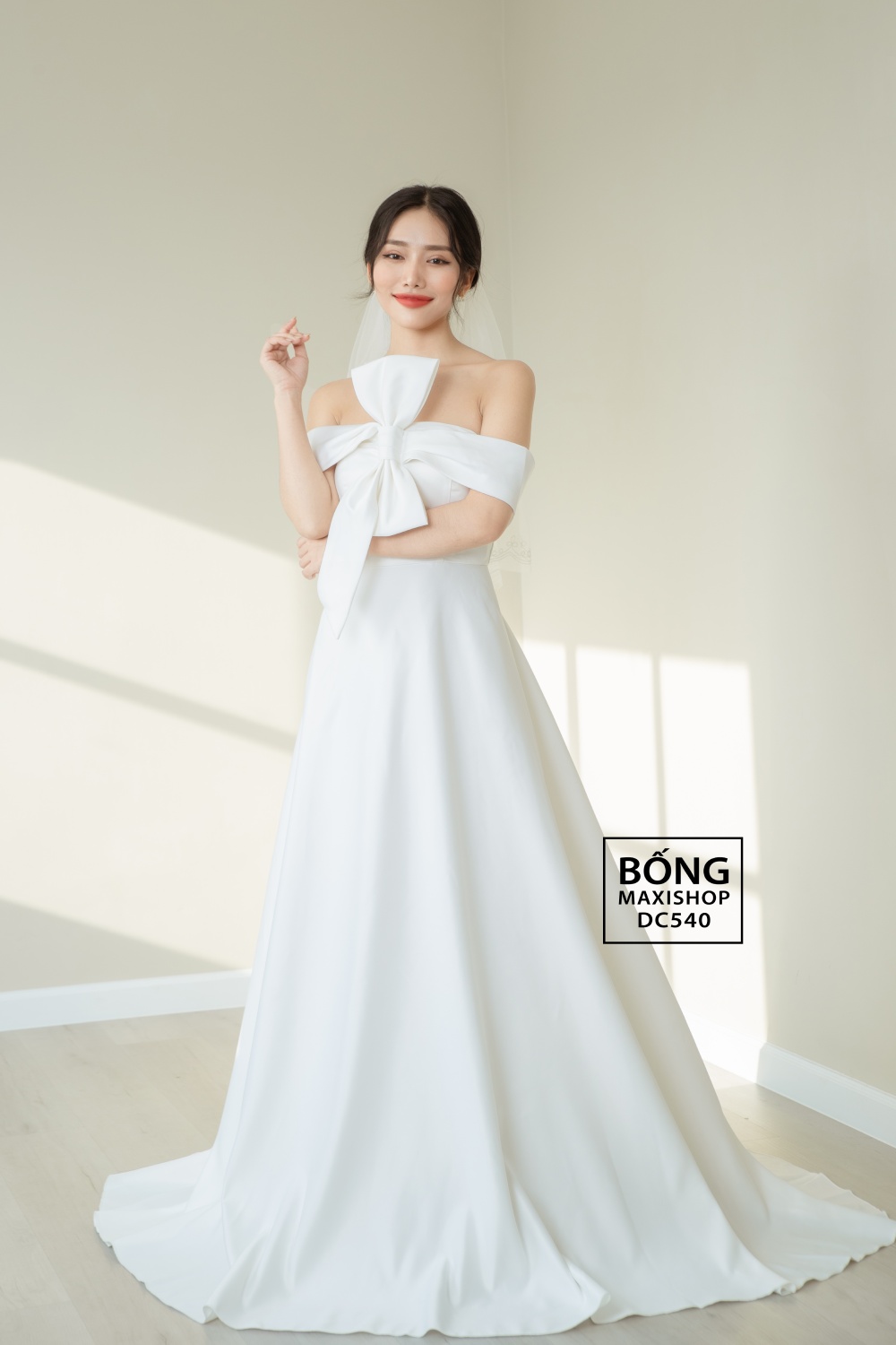 Mua ngay: Váy cưới phi nhật trắng trễ vai nơ xéo DC540