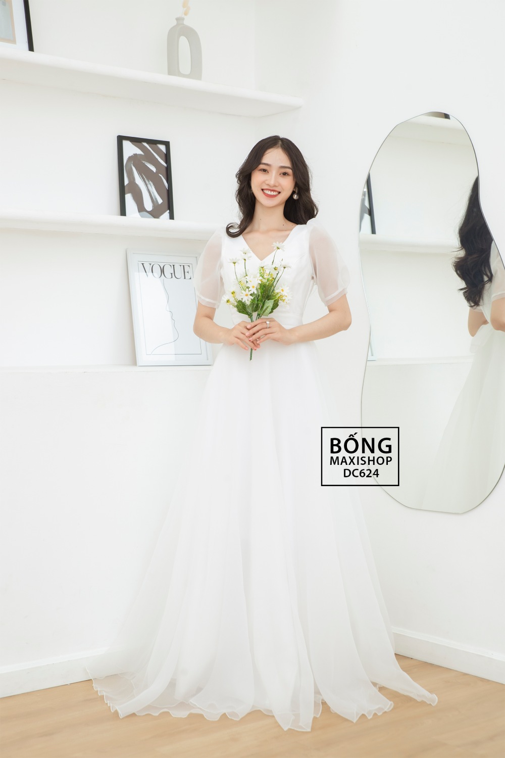 Váy cưới Xốp trắng cổ V đai eo kèm nơ DC624 thơ mộng cho cô dâu chuẩn bị kí giấy đăng ký kết hôn 2022