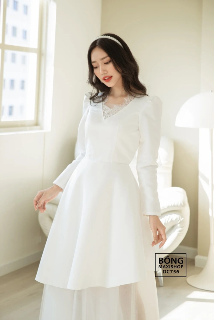 Mua ngay: Váy cưới phi nhật trắng phối lưới tay dài DC756