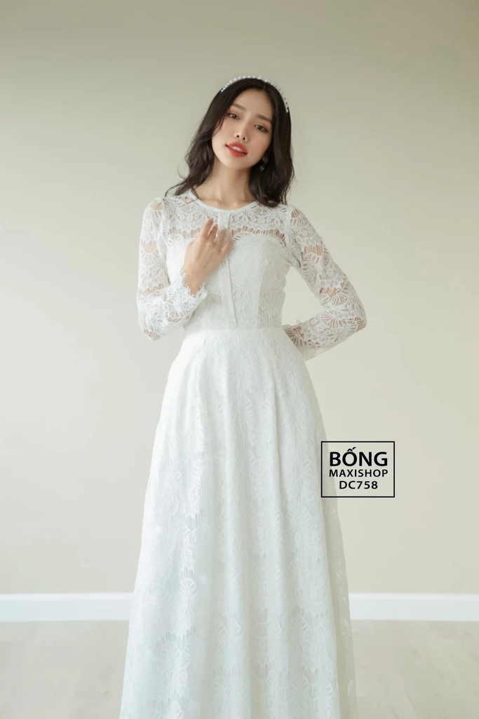 Mẫu váy cưới Full ren trắng tay dài DC758 là mẫu váy cưới sang trọng mang phong cách hoàng gia