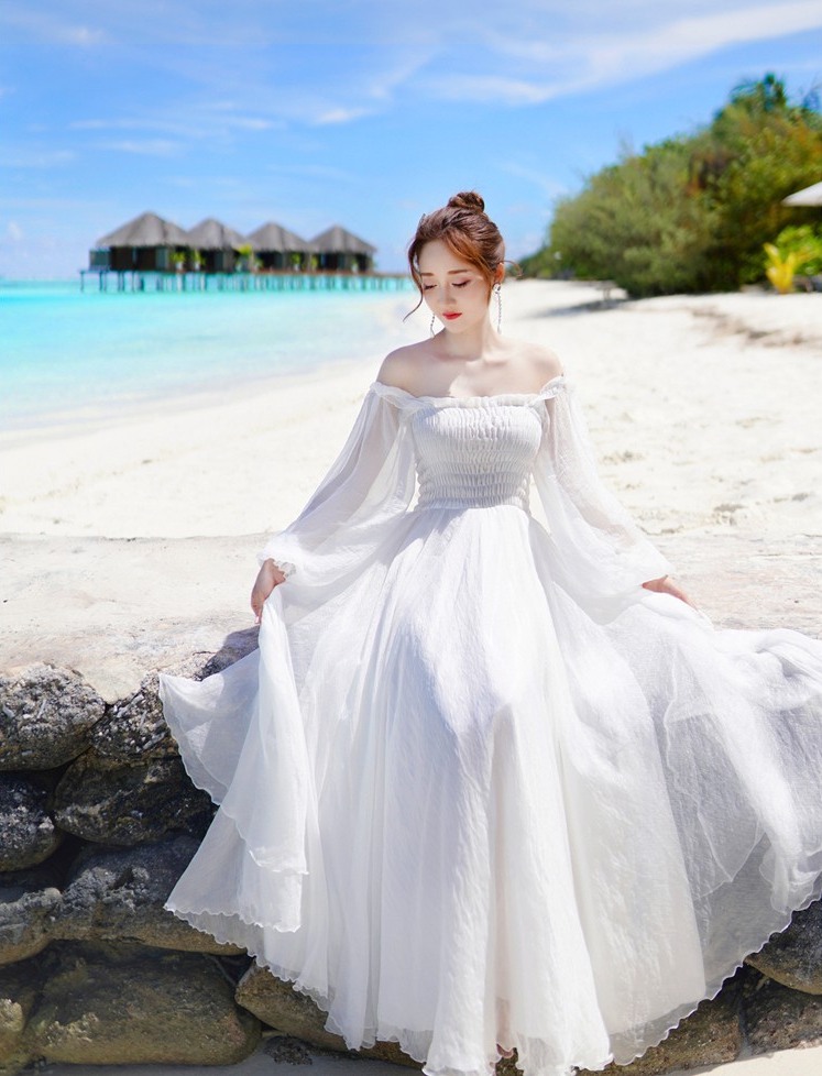 Đầm maxi 2023 trắng trễ vai được xem là sự lựa chọn lý tưởng cho những cô nàng theo đuổi phong cách tiểu thư quyến rũ. Thiết kế trễ vai tinh tế khoe trọn xương quai xanh cùng bờ vai trắng mịn. Thân áo phía trên ôm trọn cơ thể nàng kết hợp tà váy dài thướt tha đem đến khả năng "hack" dáng đỉnh cao. Đặc biệt, màu trắng tinh khôi của chiếc váy hòa quyện với màu xanh thơ mộng của biển và bầu trời mang đến những hình ảnh tuyệt đẹp khi nàng sải bước trên bờ cát.