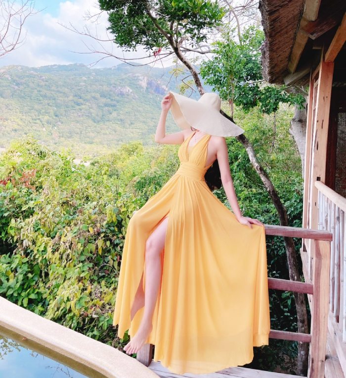 Mua ngay: Đầm Maxi Dập Ly Eo Ngực Xẻ Tà Vàng DM801