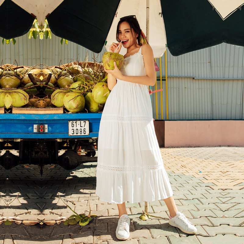 Bạn nghĩ sao về sự kết hợp thú vị giữa mẫu đầm maxi 2023 và đôi giày sneaker cá tính, từ đó tạo ra một phong cách hiện đại, trẻ trung và thậm chí hơi "street style"? Bí quyết để tạo sự hài hòa cho tổng thể chính là nếu bạn diện đầm maxi có tone màu sáng, dịu mắt, hãy phối với giày sneaker trắng hoặc màu pastel nhẹ nhàng. Ngược lại, với mẫu đầm có màu sắc sẫm hơn, bạn có thể chọn giày sneaker đen hoặc có màu đồng điệu để trông thời trang hơn.