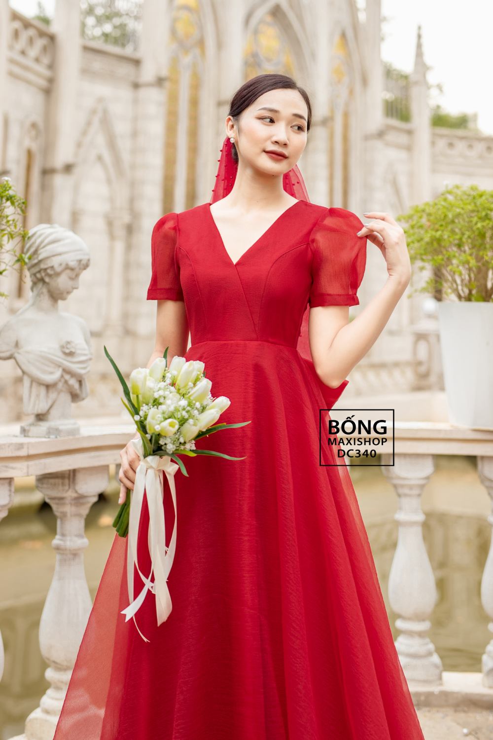 Mua ngay: Đầm cưới đơn giản màu đỏ voan xốp cổ V kèm Nơ DC340D