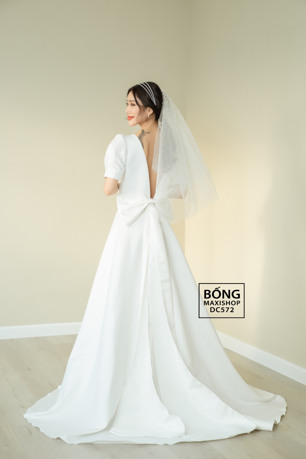 Đầm cưới đơn giản phi nhật trắng hở lưng V đuôi nơ DC572