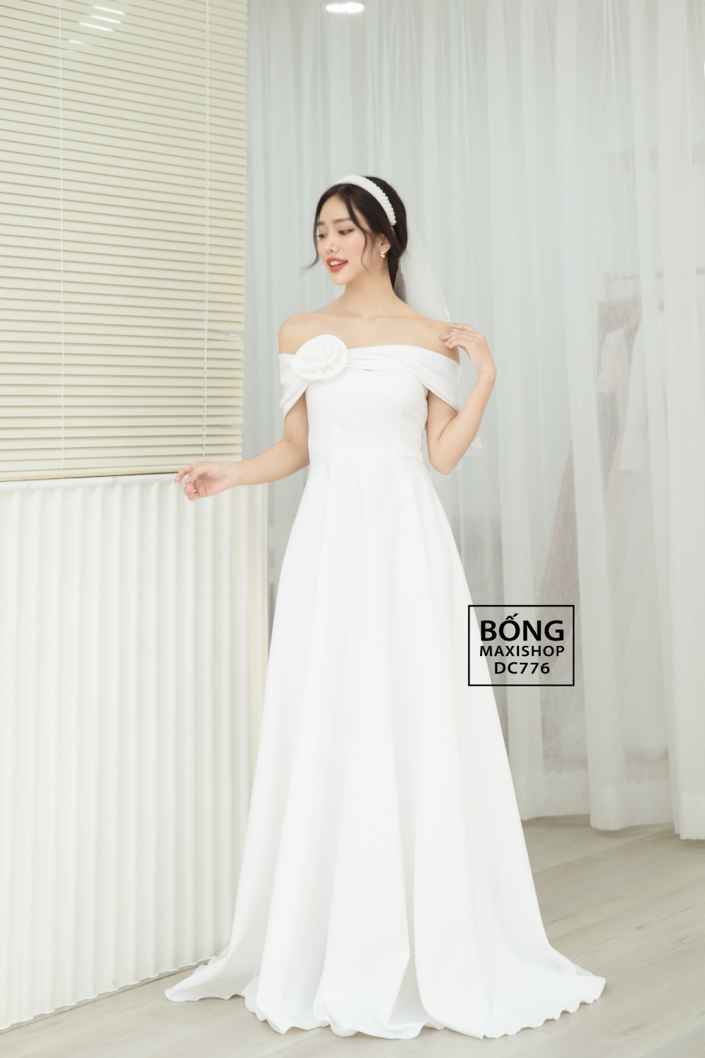 Đầm cưới đơn giản phi nhật trắng trễ vai hoa DC776PNT