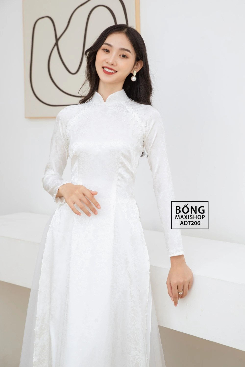 Mua ngay: Áo dài cô dâu gấm trắng 4 tà tủa ngọc ADT206