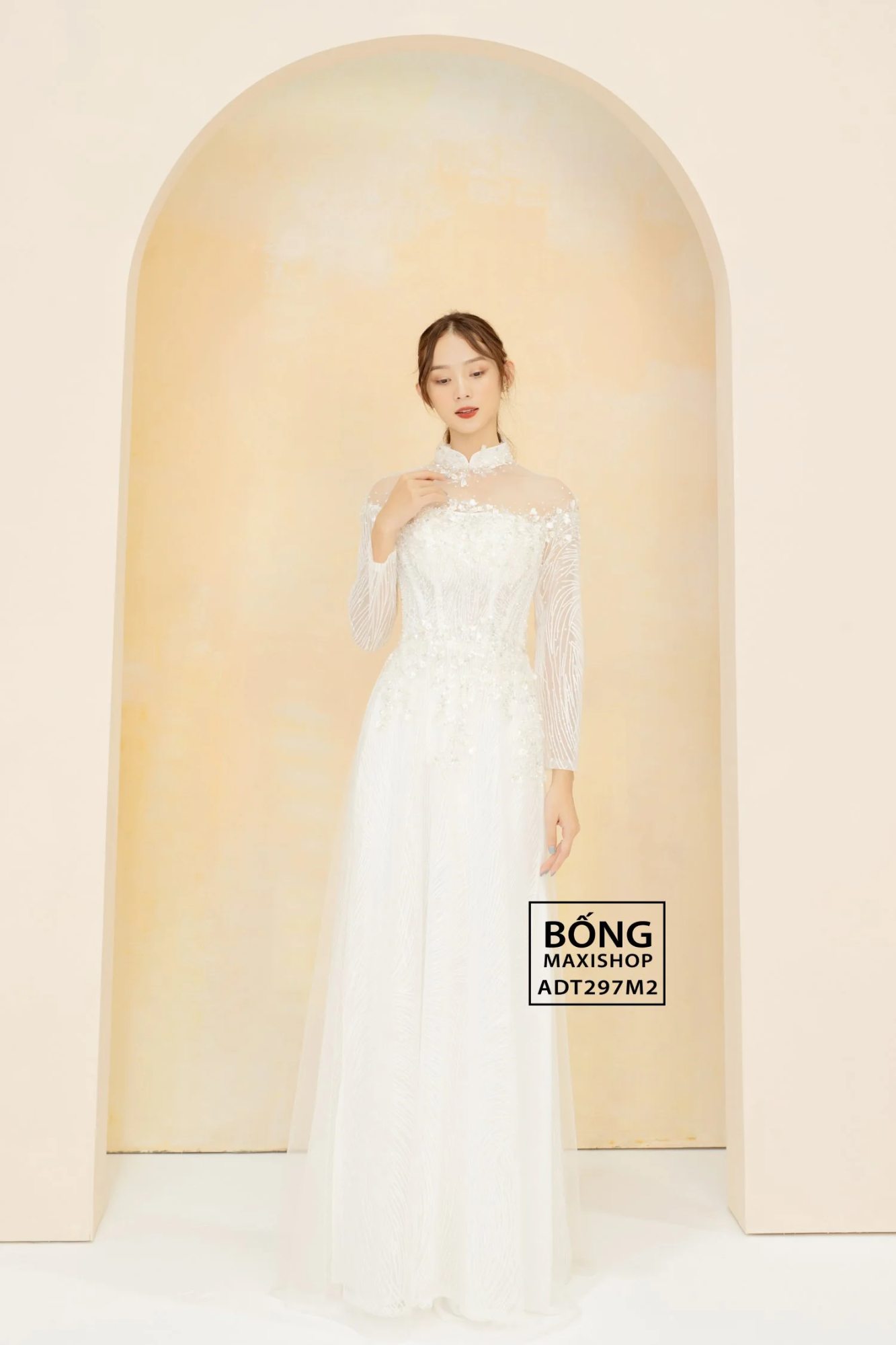 Mua ngay: Áo dài cô dâu ren kim tuyến sọc cườm tim ADT297M2