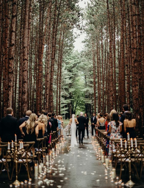 Đám cưới trong rừng được giới trẻ yêu thích cũng được tổ chức ngoài trời, địa điểm được yêu thích gần đây là rừng thông Đà Lạt, nơi có khung cảnh rất lãng mạn và thời tiết mát mẻ quanh năm. Lễ cưới trong rừng không nhất thiết phải trang trí cầu kỳ vì thiên nhiên đã ban cho các cặp đôi một phòng tiệc hoàn hảo, chỉ cần thêm một vài phụ kiện trang trí mang phong cách cổ điển là buổi lễ sẽ trở nên lung linh, nên thơ thêm bội phần.