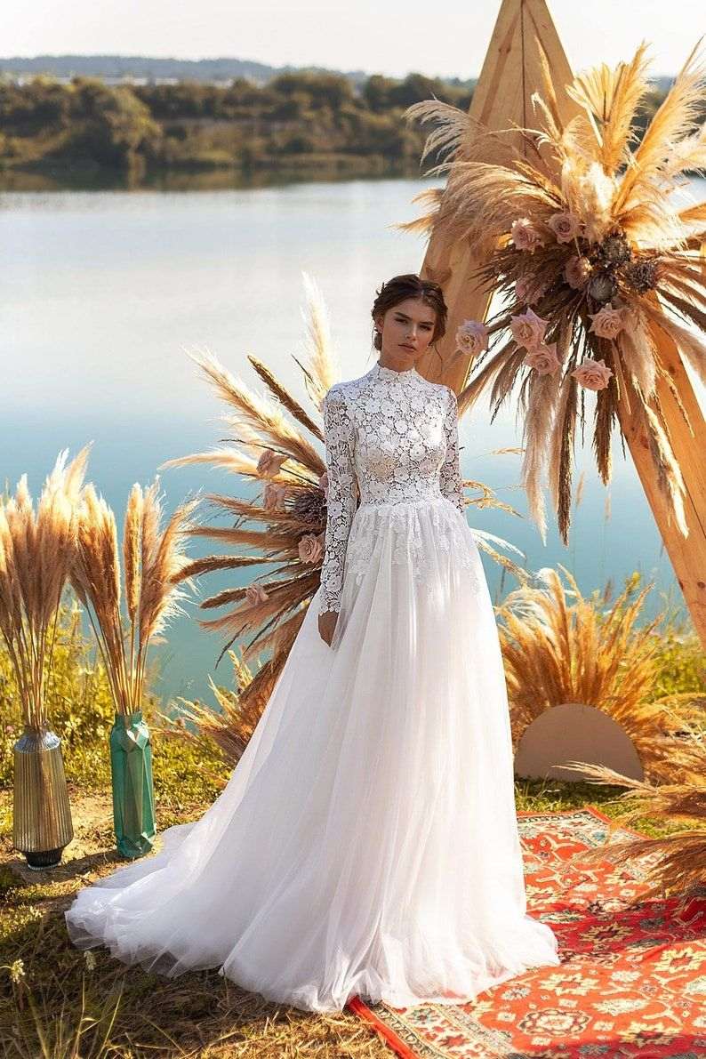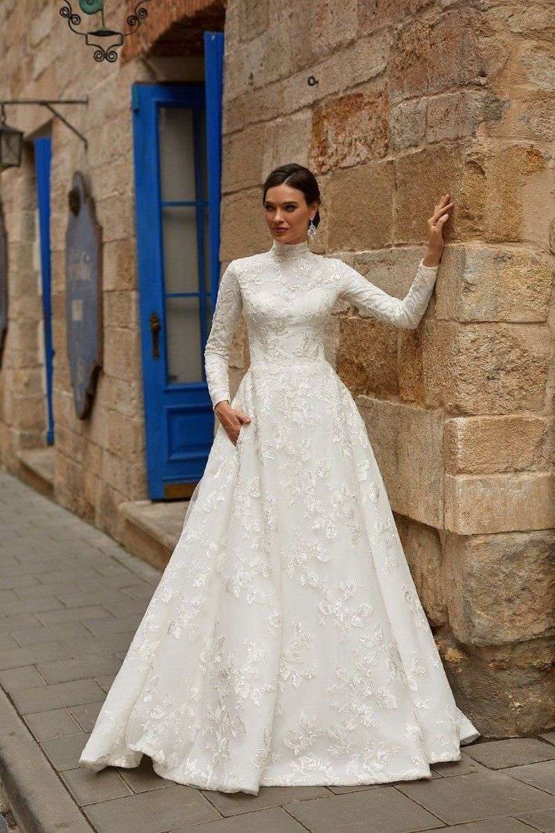 Váy cưới kín đáo cổ cao làm từ vải voan và ren