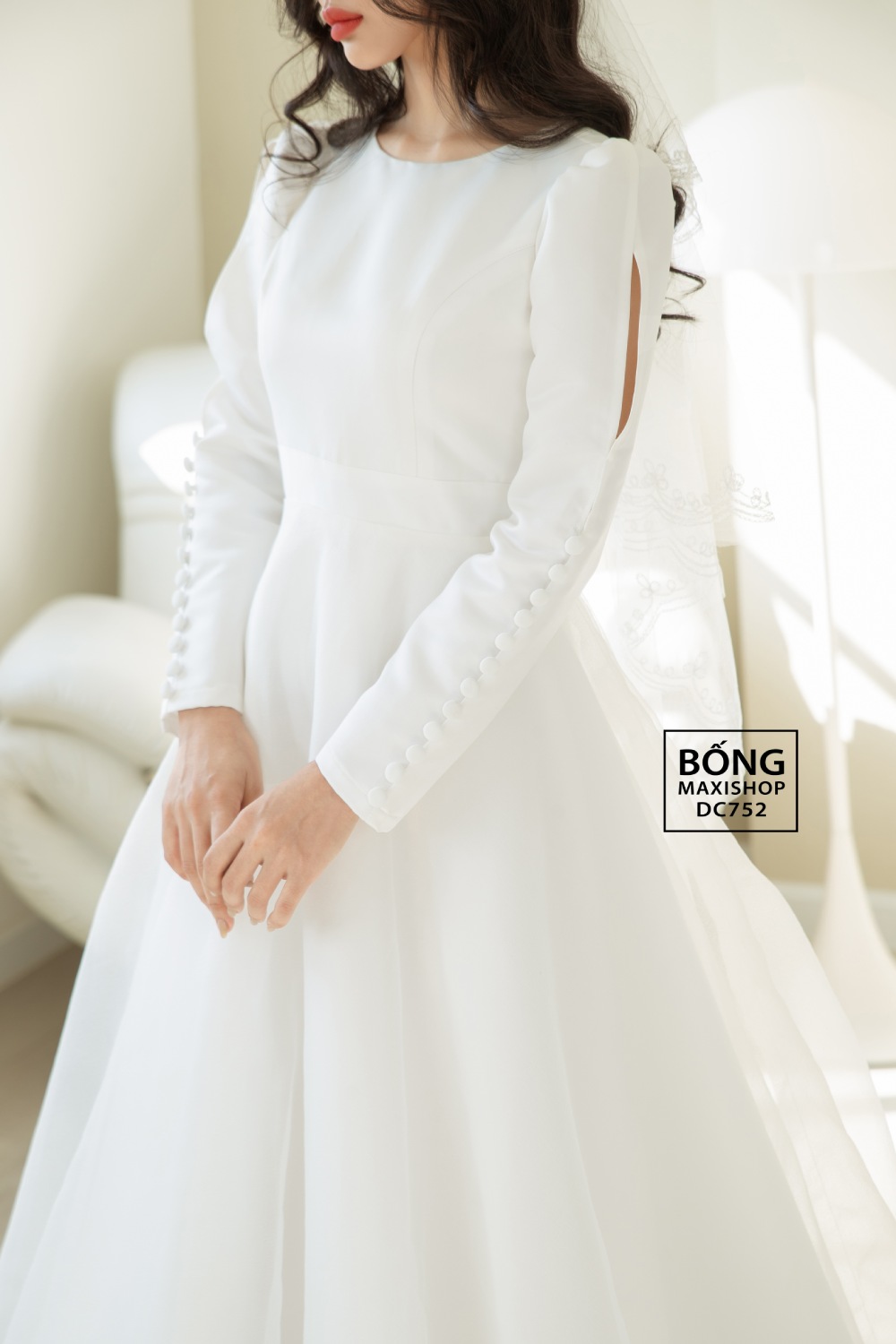 Váy cưới kín đáo phi nhật trắng phối voan xốp tay hàng nút DC752