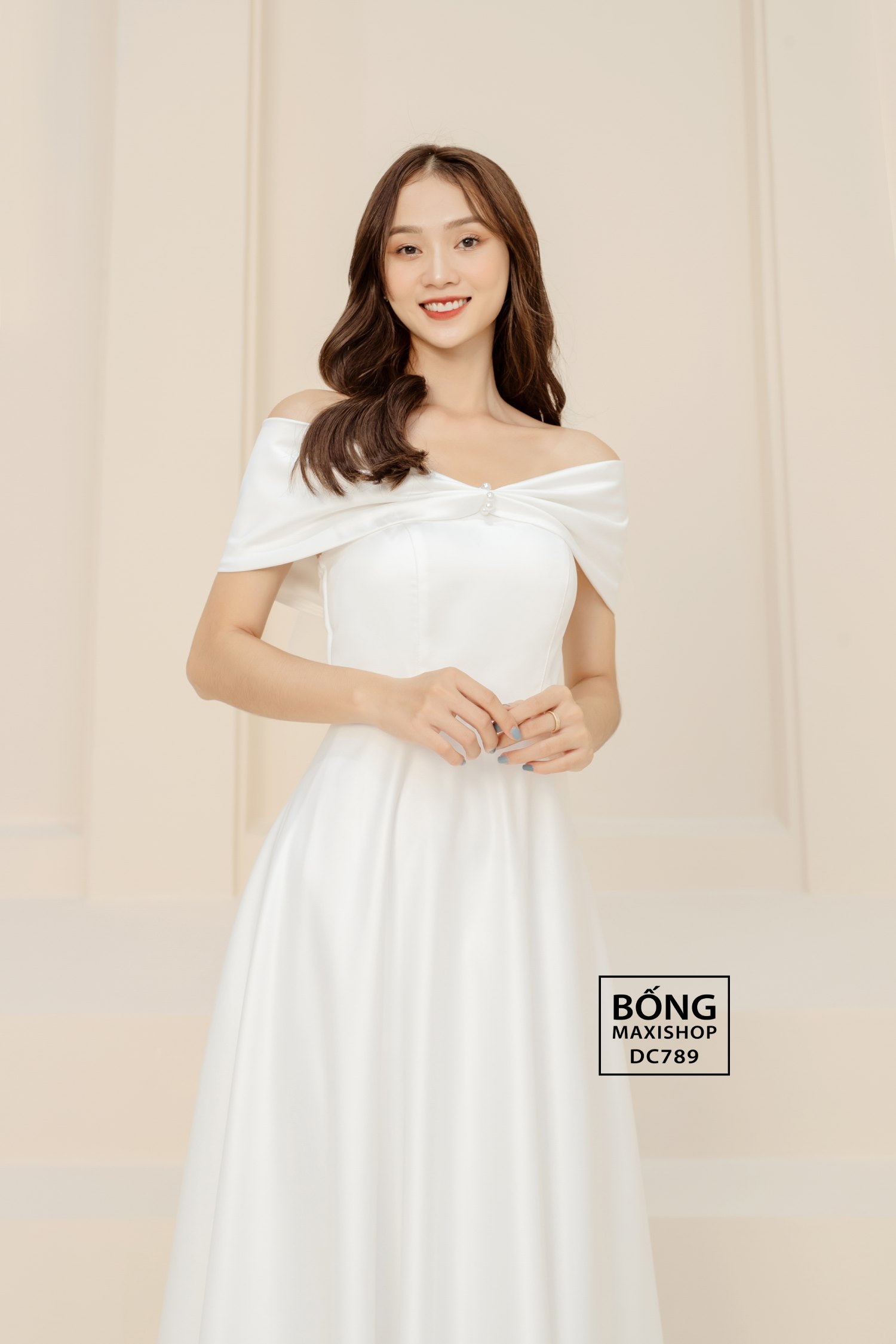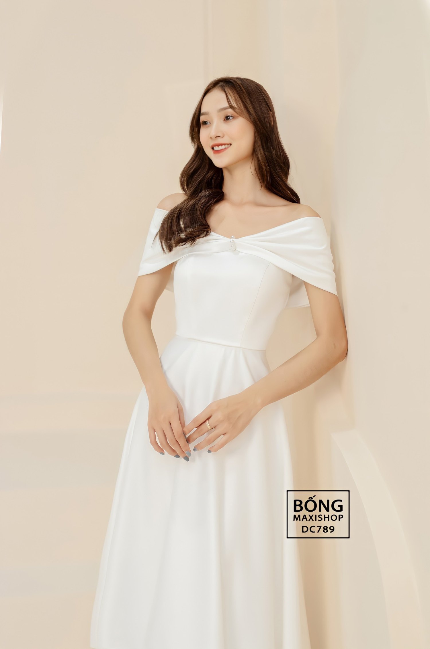 Váy cưới phi nhật trễ vai trắng đính ngọc tròn DC789 đơn giản nhưng vẫn đủ thu hút ánh nhìn. Một chiếc váy cưới đẹp không nhất thiết phải cầu kỳ mà phải khoe được nét đẹp của cô dâu. Nhờ chất liệu vải phi nhật có phần cứng cáp, bóng nên chiếc váy được định hình tốt với những đường cắt, may tỉ mỉ đầy sang trọng. Chiếc váy cưới ôm lấy phần eo trong khi chân váy xòe, có độ bồng bềnh vừa mang nét dịu dàng, thướt tha vừa tôn lên vóc dáng của nàng. Thiết kế trễ vai được cách điệu cùng với những hạt ngọc tròn tại phần trung tâm, trông như một chiếc nơ khoe trọn bờ vai của cô dâu tạo sự quyến rũ pha lẫn sự duyên dáng.