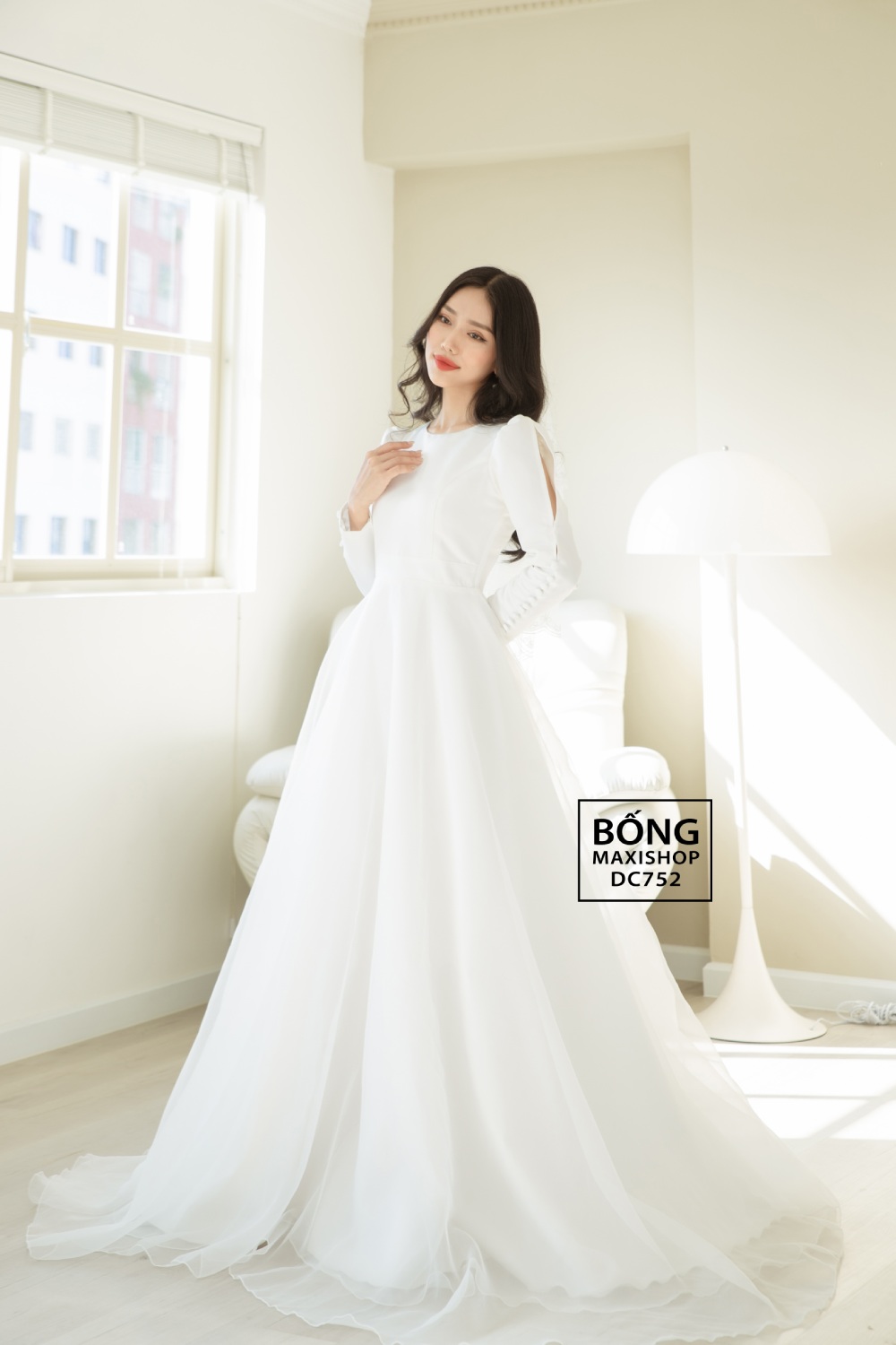 Đầm cưới đơn giản phi nhật trắng phối voan xốp tay hàng nút DC752