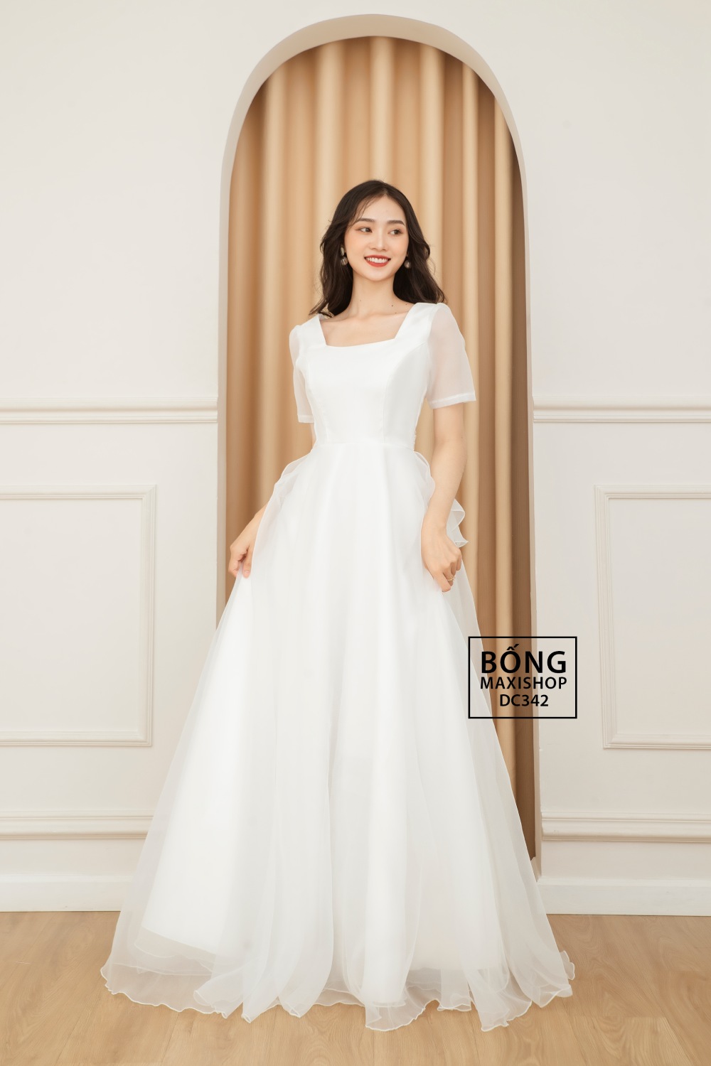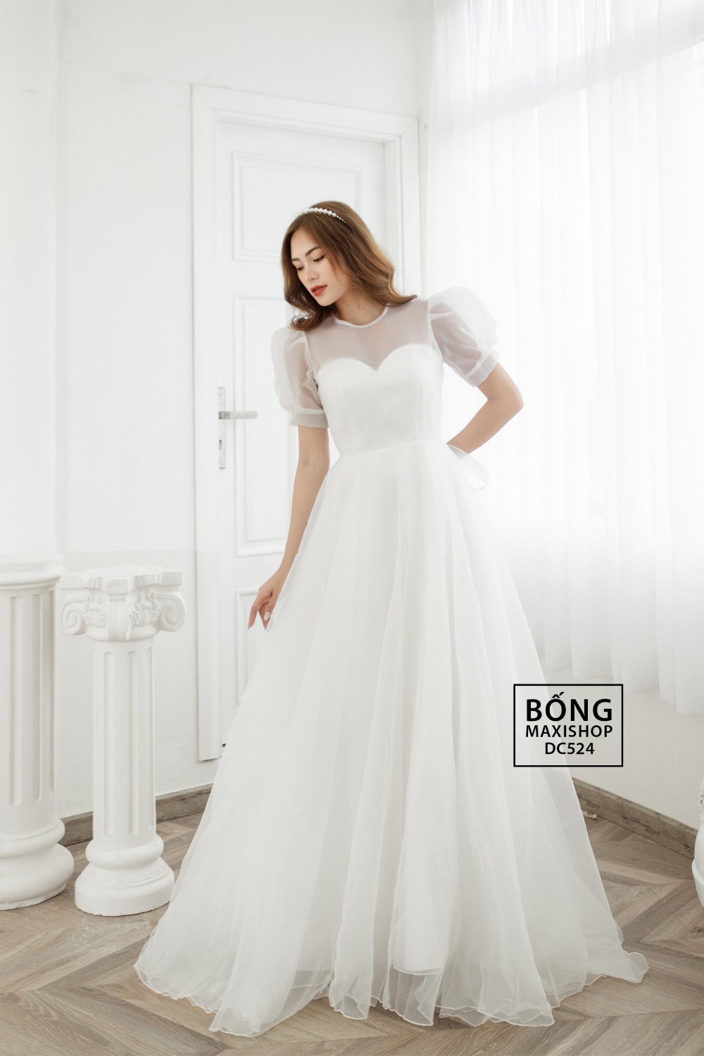 Đầm cưới đơn giản xốp trắng tay phồng DC524
