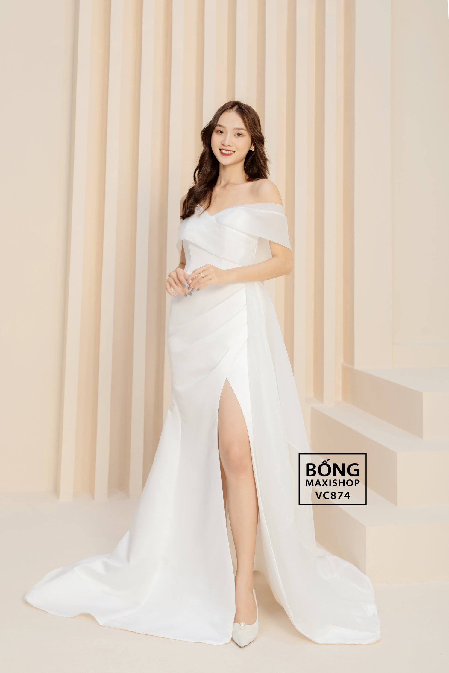 2. Mẫu váy cưới hot 2022 Váy cưới phi nhật trễ vai kiếng xẻ tà đuôi cá trắng VC874